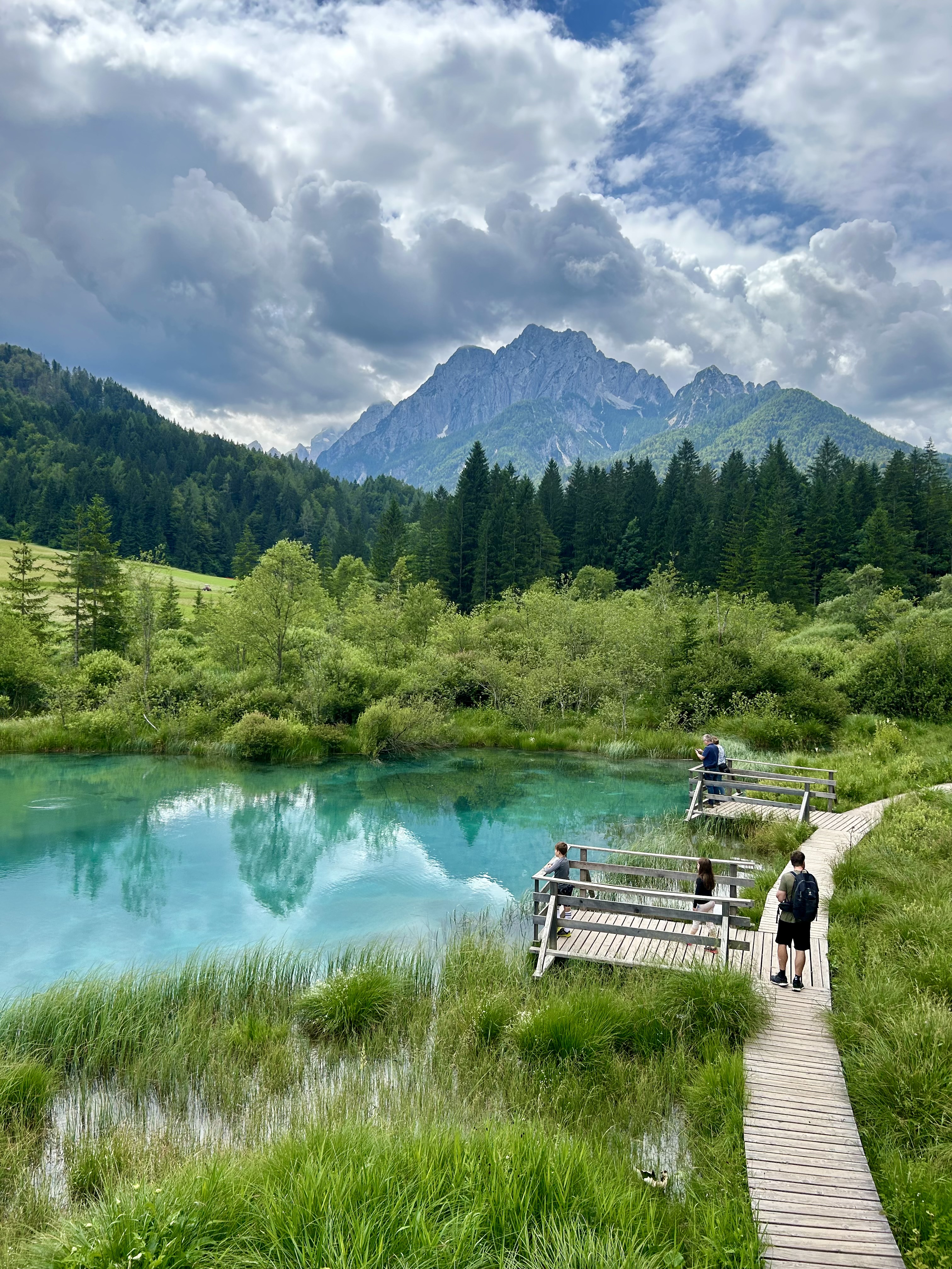 First to Zelenci, where the Sava Dolinka river starts. Emerald pools bubbling up through a small wetland area. Wooden walkways across the marsh.