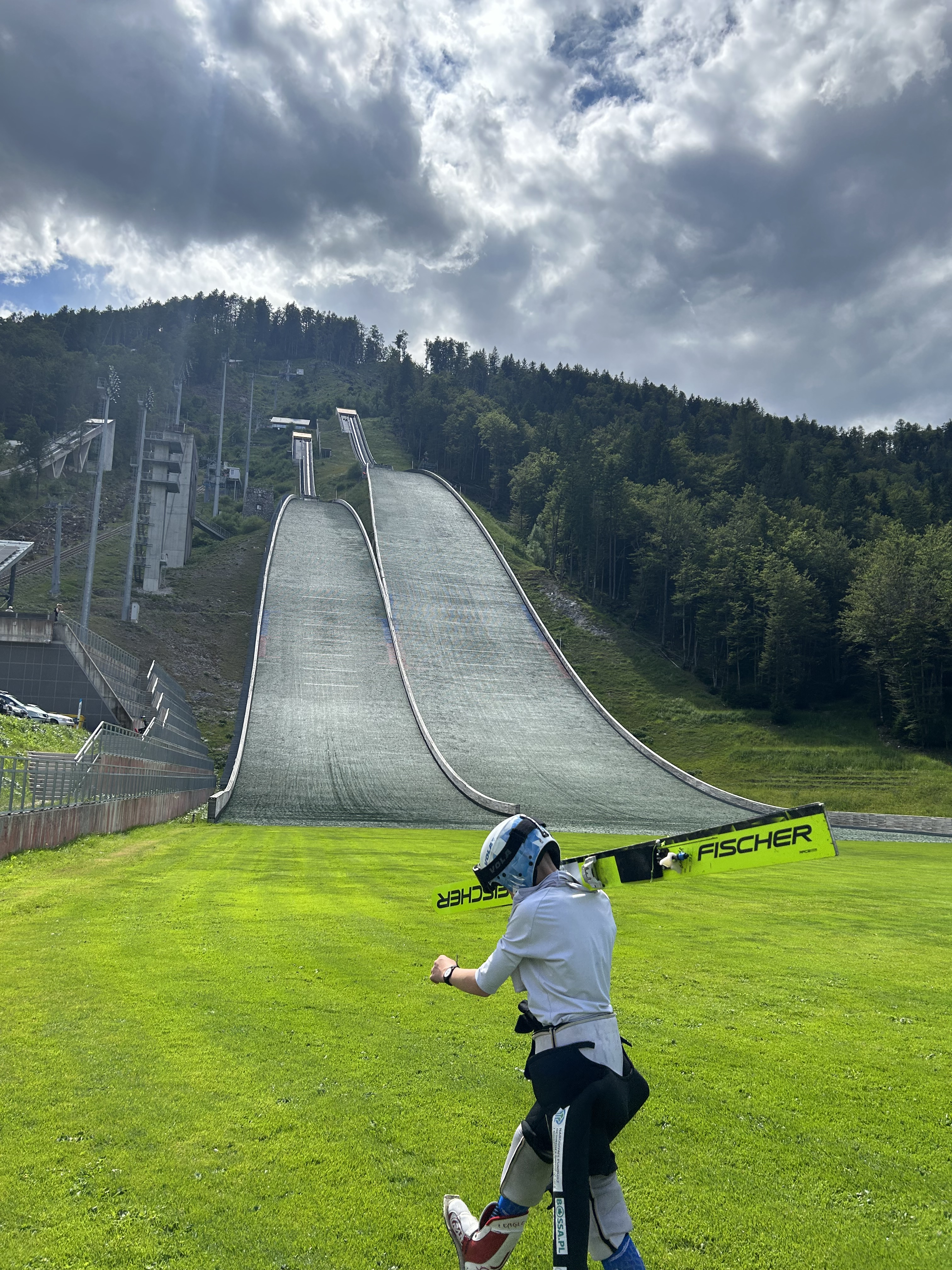 Even in summer there are jumpers training. They slide down the ramp and land far below on the grass.