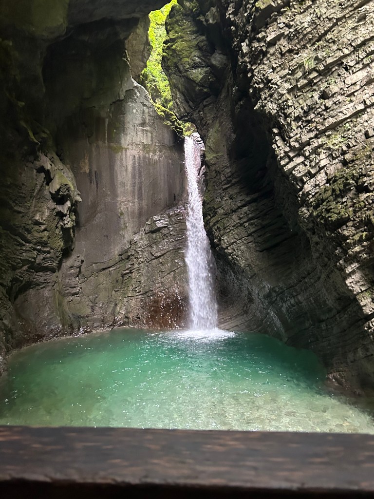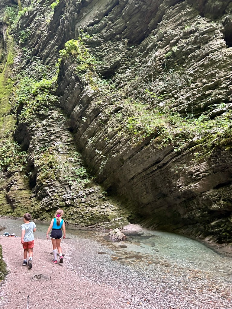 Near the little town Kobarid, is also the Kozjak Waterfall. A trail follows the gorge through forest and across wooden bridges. To us the walk in turns out to be more interesting than the waterfall itself.