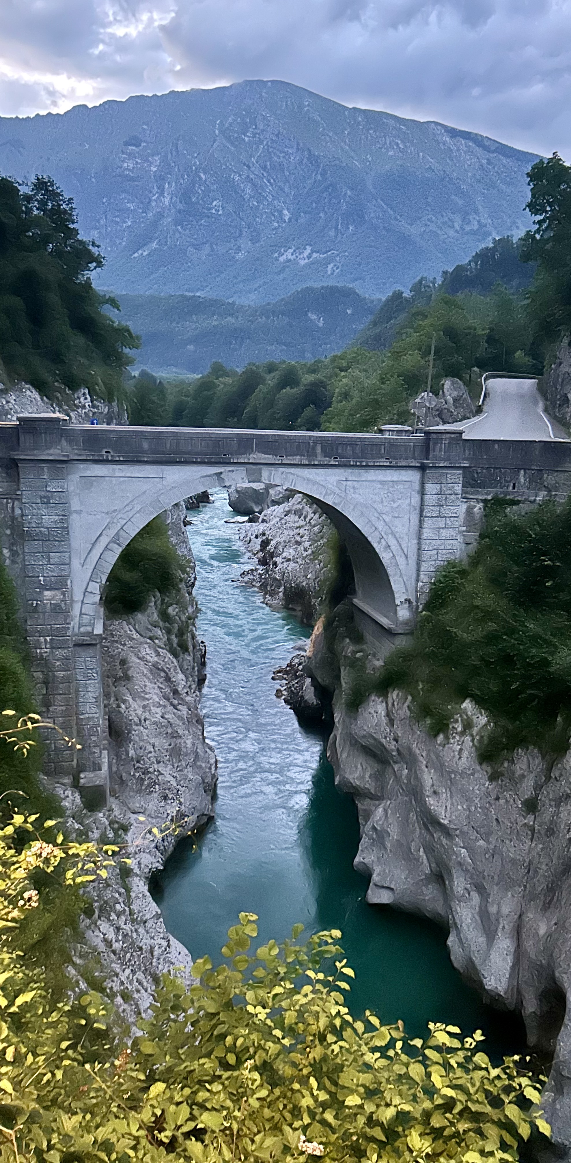 The emerald river is well-known for rafting. a stone arch Bridge, from 1750, crossed by Napoleon’s troops on their march toward the Predel Pass, spans the narrow gorge.